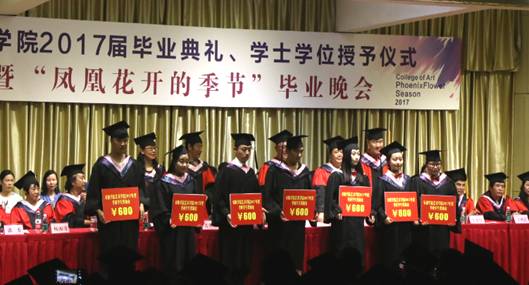 党总支书记王辉宣读《太阳成集团tyc关于对2017年创新创业优秀员工的表彰决定》,钟生海副董事长为2013级视觉传达设计专业桑玄同学颁发奖金。