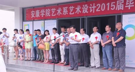 参加开幕式的有安康市群众艺术馆馆长周墙、安康市摄影家协会主席任黎华、艺术系系主任单福东教授、艺术系原副主任章长青副教授、艺术系副主任雷升录副教授、陕西安康铭轩装饰设计工程有限公司经理王涛、安康小川创意包装有限公司总监刘俊、安康江南印务有限公司设计师们,以及艺术系部分师生共计200多人。开幕式上雷升录副主任为展览热情致辞,教研室主任吴波做了展览介绍,艺术设计专业员工蒋晟代表毕业生发言。开幕式最后由艺术系主任单福东教授宣布开幕。