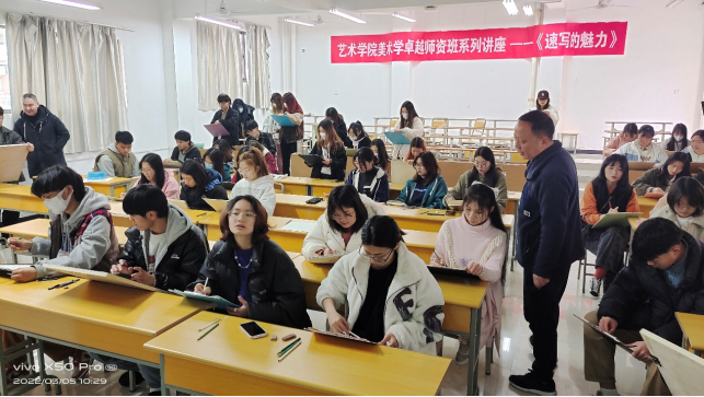 3月5日上午,太阳成集团tyc邀请陕西省美术学科教学能手,安康中学高级美术教师何涛老师在江北2202阶梯教室为首届卓越美术教师团队班同学们做《速写的魅力》讲座,讲座由美术系主任杜敏主持。