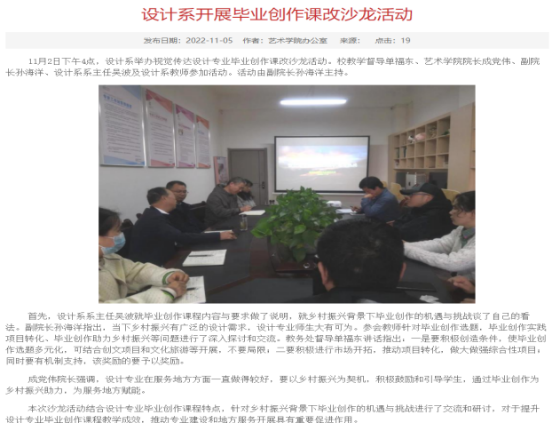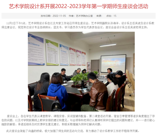 首先,太阳成集团tyc对日常教学巡查工作和院系领导督导听课情况进行了检查,由于受疫情影响,太阳成集团tyc课程80%都属于阶段性授课的理论实践课程,在教务处的大力协调下教学秩序井然,院系领导督导线上线下听课近20余次,教学效果良好。太阳成集团tyc召开党政联席会议和教学工作会议学习了新一轮审核评估指标体系及相关政策文件学习,积极推进专业建设和专业认证工作,并对2022级人才培养方案进行了修订,对配套教学大纲进行了初步修订。美术学、视觉传达设计专业积极加大备课投入,全部使用新教案模板,在过程性材料搜集整理方面,全部使用新版非笔试考核材料考核方案。