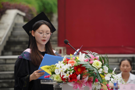 教师代表谢敏希望同学们能以妙笔生花的作品、别出心裁的设计、娓娓动听的音乐来谱就属于自己崭新的未来;更希望同学们以志存高远的勇气、恪己守正的骨气、自信乐观的底气来书写精彩的人生篇章。