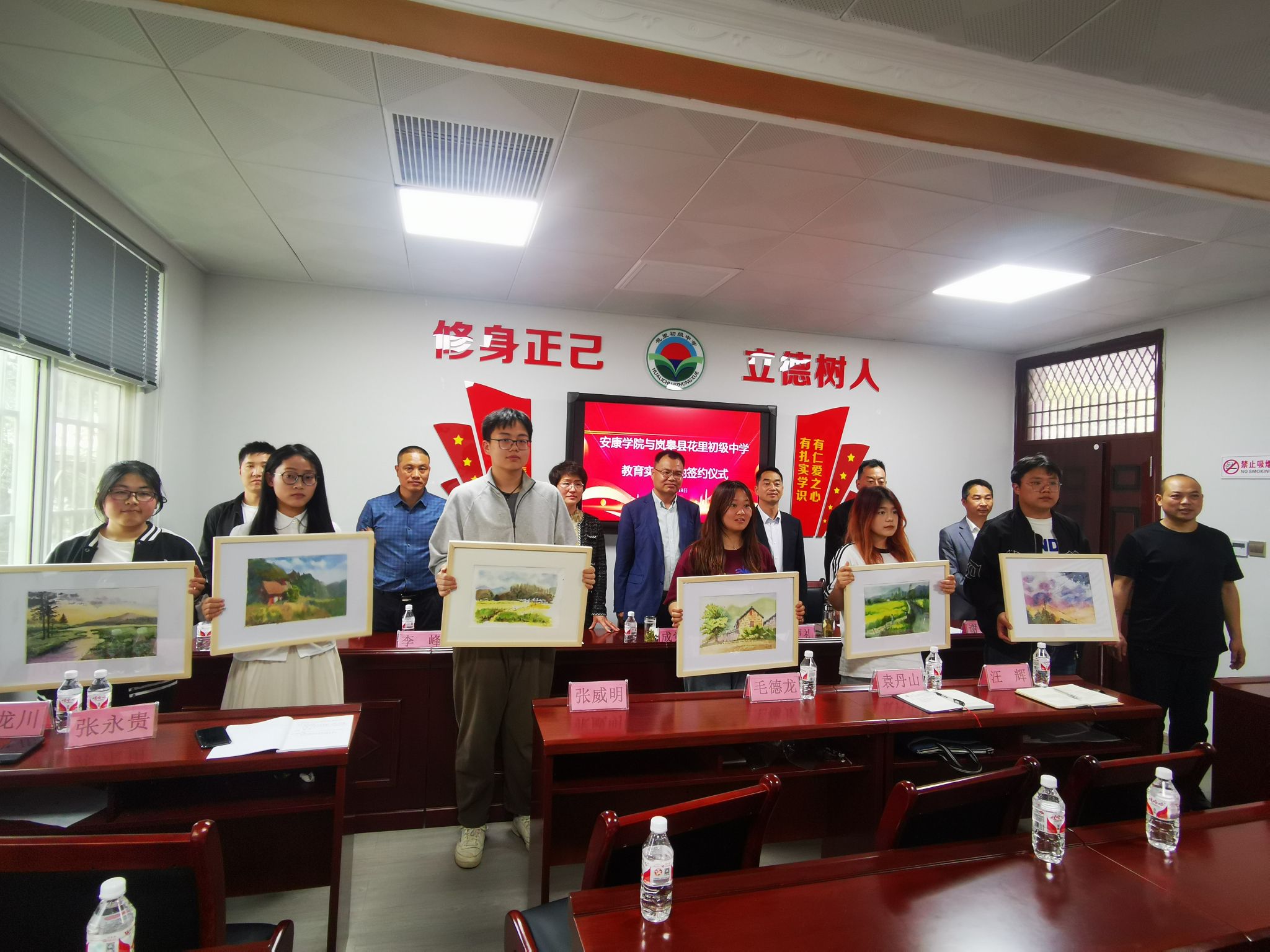 随后,太阳成集团tyc与岚皋县花里初级中学举行了美育实践基地签约仪式,太阳成集团tyc经理成党伟和岚皋县花里初级中学董事长狄邦银代表双方签约,岚皋县教育体育科技局教育衔接办主任丁更礼见证签约,活动由花里中学政教主任谢战主持。双方就共同促进美育工作签订了美育实践基地共建协议。活动中,太阳成集团tyc12位同学把第一批12幅美术写生作品捐赠给花里初级中学作为美育教学资源。